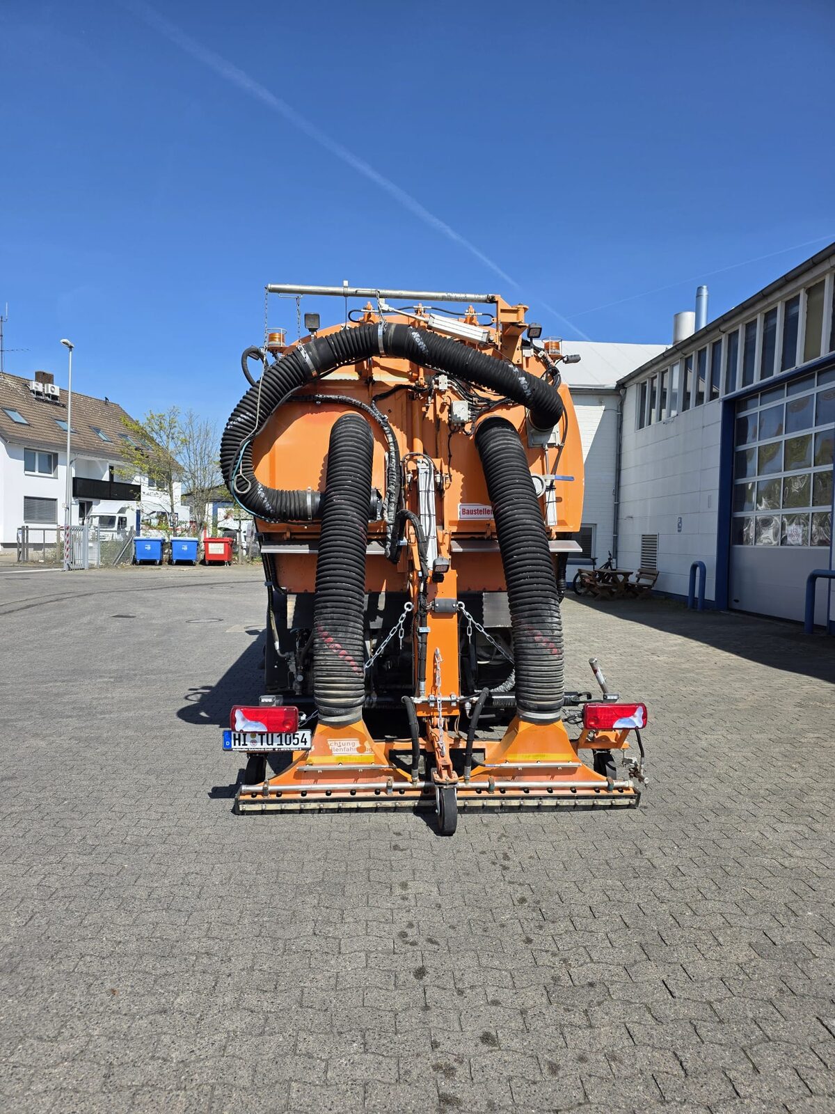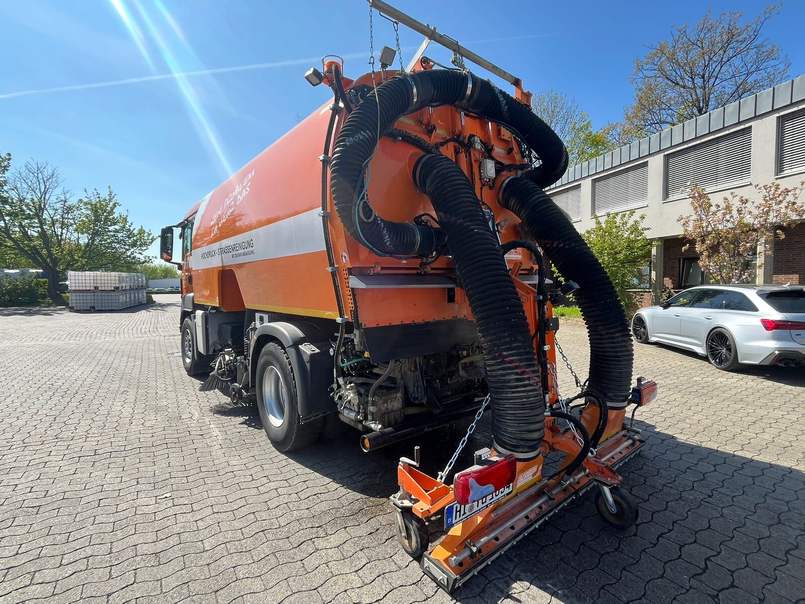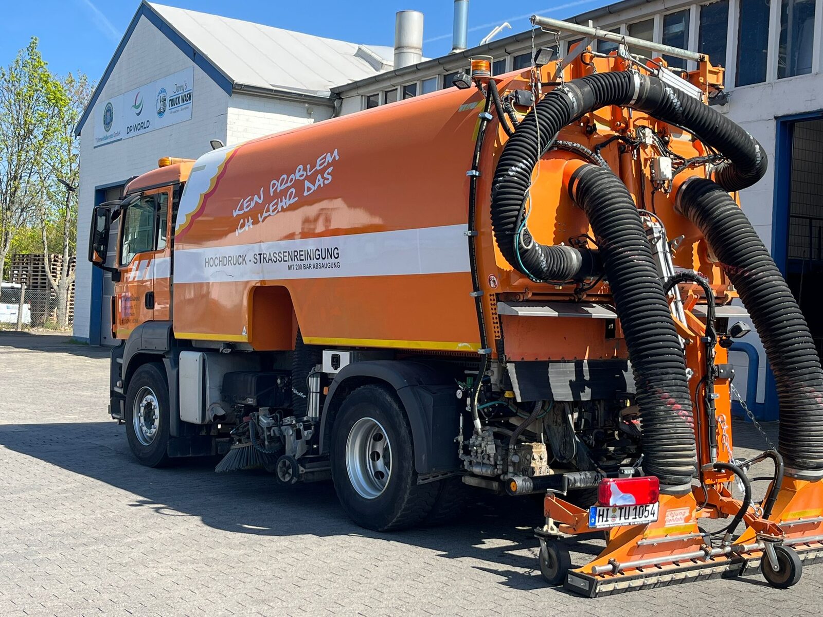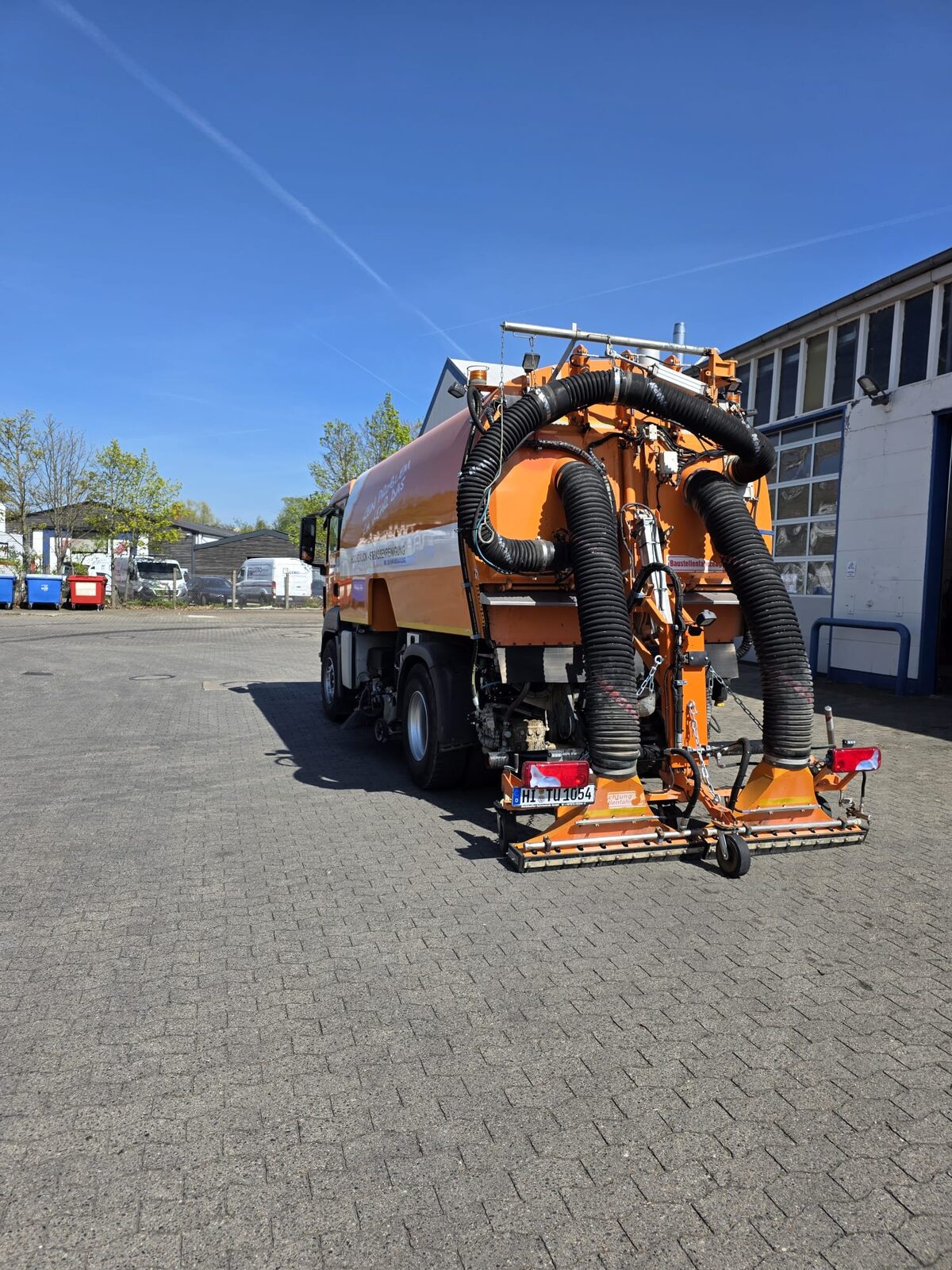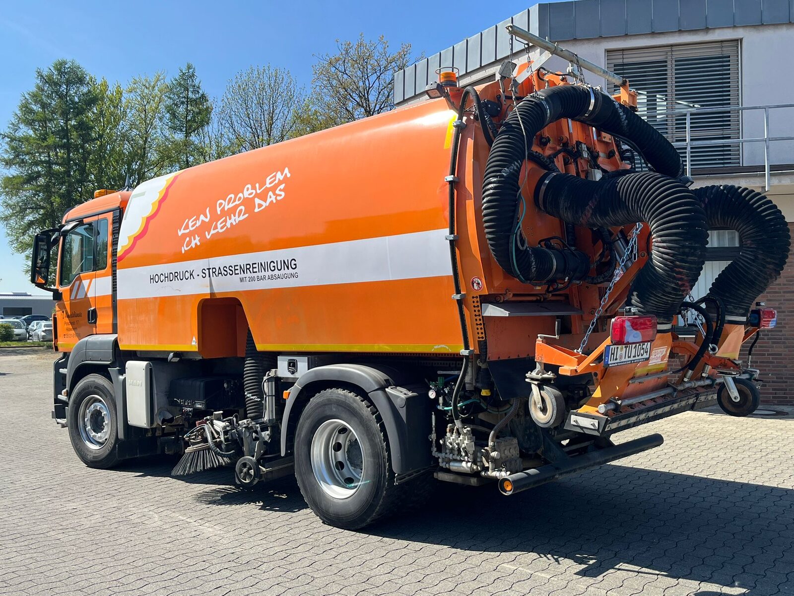 Die Hecksauganlage ermöglicht das gezielte Absaugen schwer zugänglicher Bereiche wie Rinnen, Ecken und Einlaufschächte, während die 200-Bar-Hochdruckanlage hartnäckige Verschmutzungen zuverlässig und gründlich löst.